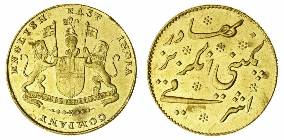 East India Company, Madras Presidency, gold Mohur / Ashrafi, c. 1819, 11.69g, shield of arms flanked by supporters, rev. Persian inscription (Stevens 4.4; F 567; Pr 241; KM 412.2), with ticket of provenance, obverse with small edge dent, surface marks, extremely fine,
