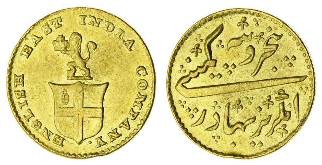 East India Company, Madras Presidency, gold 5-Rupees (1/3-Mohur), 3.87g, undated (1820), lion holding crown left above shield, rev. Persian legend: panj rupiya kampani angrez bahadur (Stevens 4.7; F 570; Pr. 244; KM 422), with ticket of provenance, a couple of small edge defects, good very fine