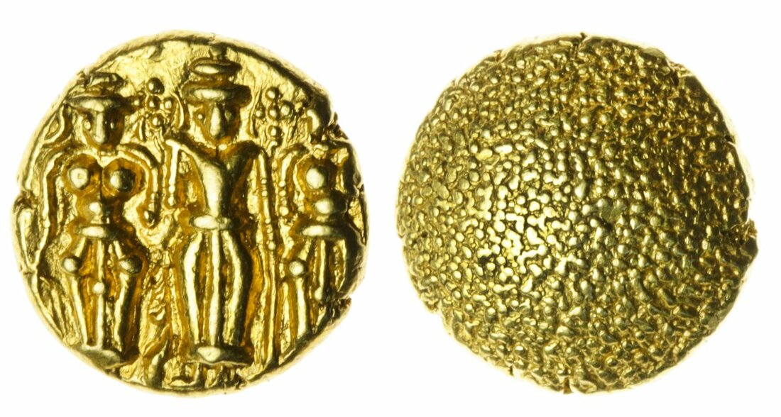 East India Company, Madras Presidency (c.1691-1740), gold Pagoda, 3.43g, three full-length standing deities, rev. granulated (Pr 3a; KM 289; Stevens 1.3), good very fine