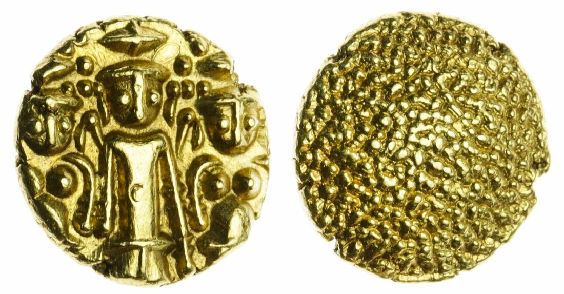 East India Company, Madras Presidency (c.1750-1806), gold Pagoda, 3.43g, three standing deities, half length, rev. granulated (F 659; Pr 3b; KM 304; Stevens 1.4), edge crack, about extremely fine