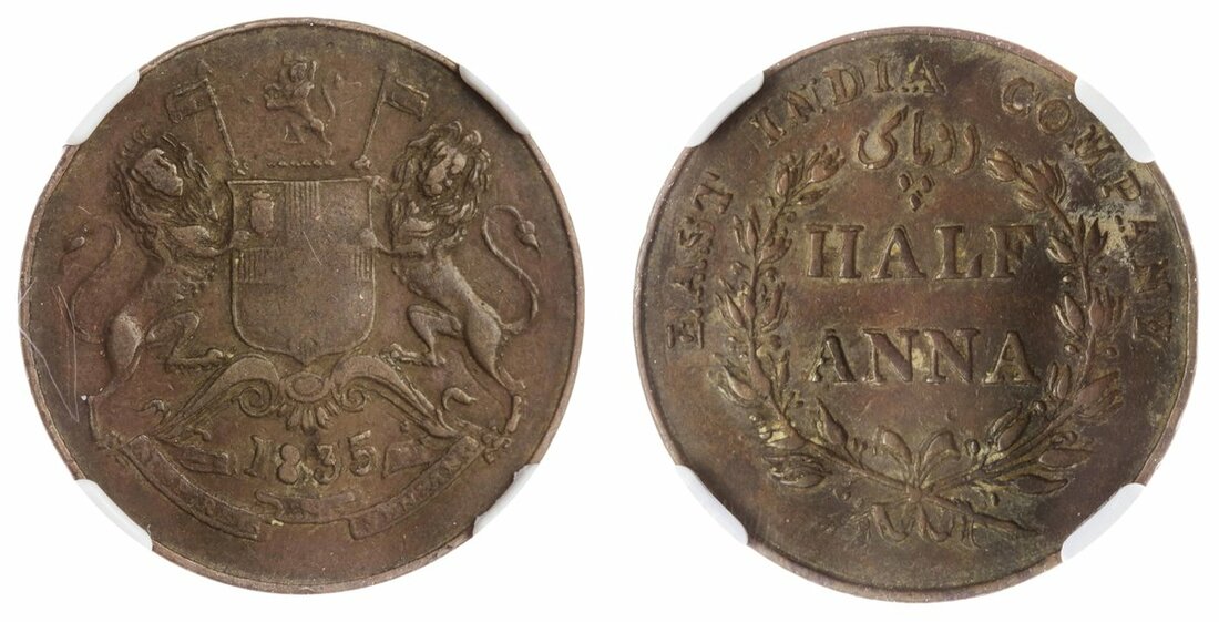 East India Company, Half-Anna, 1835, Bombay, double-struck error (Stevens 1.79; Pr.131), graded by NGC VF details (environmental damage)