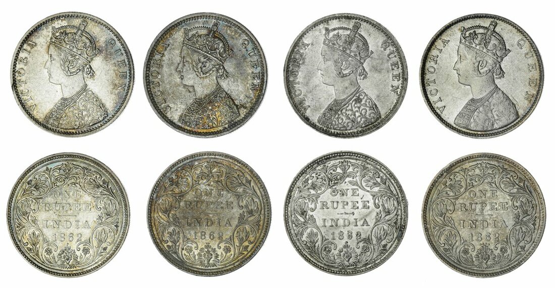 British India, Victoria, Rupees, 1862 (4), Bombay mint, bead types 0 / 4 (1866-7), 1 / 1 (1873-4), 1 / 2 (2 different) (1874-5) (S & W 4.73, 4.92 var(obv. I, crescent at bottom left of shoulder), 4.99, 4.100; Pr. 81, 99, 103, 105), with original envelopes from Puddester sale, about extremely fine or better (4)