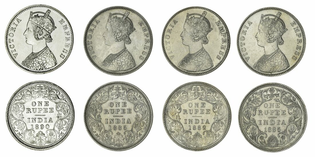 British India, Victoria, Rupees (4), 1882B (bead), A / I, 1885B (B incuse) C / I, 1885B (B raised) A / II, 1890C C / I (S & W 6.64, 6.85, 6.88, 6.112; Pr. 131, 160, 168, 170), the first with a small scratch in obverse field, the middle two described as 'restrike', otherwise uncirculated (4)