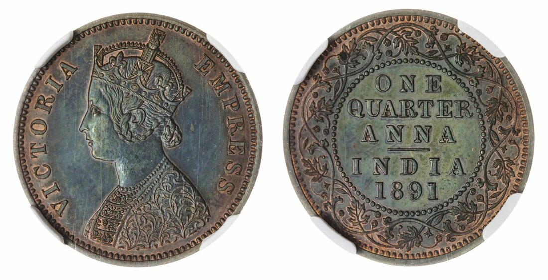 British India, Victoria, original proof Quarter-Anna, 1891 C (Stevens 6.514; Pr -), graded by NGC PF 63 BN