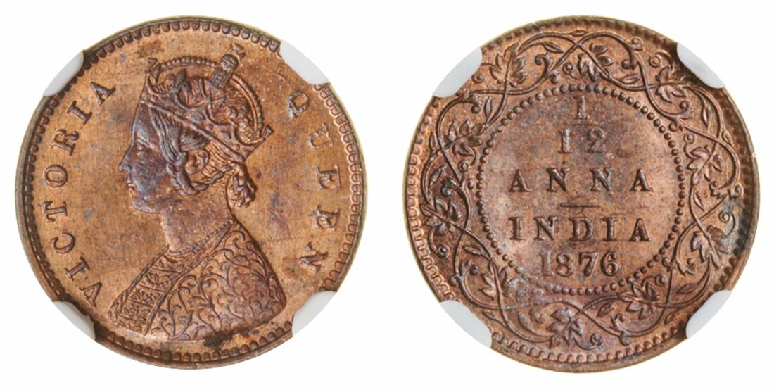 British India, Victoria (1837-1901), AE 1/12-Anna, 1876 C (S & W 5.62; Pr. 785), graded by NGC MS64 RB
