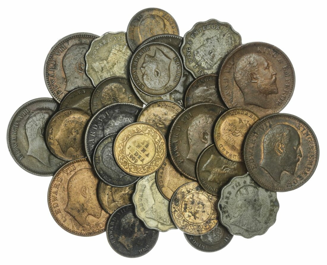 British India, Edward VII, base metal coins (28), cupro-nickel 1-Annas (4), 1907, 1909 (2), 1910, AE Quarter-Annas (10), 1903, 1905 (2), 1906 (2), 1907 (2), 1908, Half-Pice (5), 1853C, 1862 (2), 1885, 1888, 1/12-Annas (14), 1905, 1907, 1908 (6), 1909 (3), 1910 (3), generally fine or better, one each of the1905 and 1906 Quarter-Annas extremely fine with lustre, as are a couple of the 1908 and 1909 1/12-Annas (28)