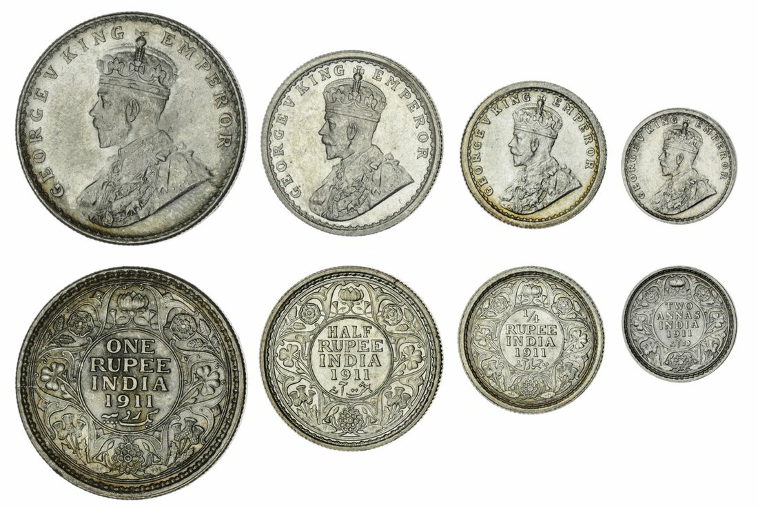 British India, George V, 'Pig' Rupee, Half-Rupee, Quarter-Rupee, 2-Annas, 1911, all Calcutta mint (S & W. 8.11, 8.61, 8.136, 8.194; Pr. 207, 318, 440, 564), about uncirculated to uncirculated, scarce and difficult to find in this condition (4)