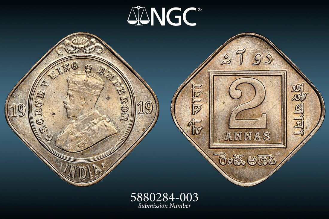 British India, George V, Cu. Ni. 2-Annas, 1919 C (S & W 8.225; Pr. 881) graded by NGC (5880284)