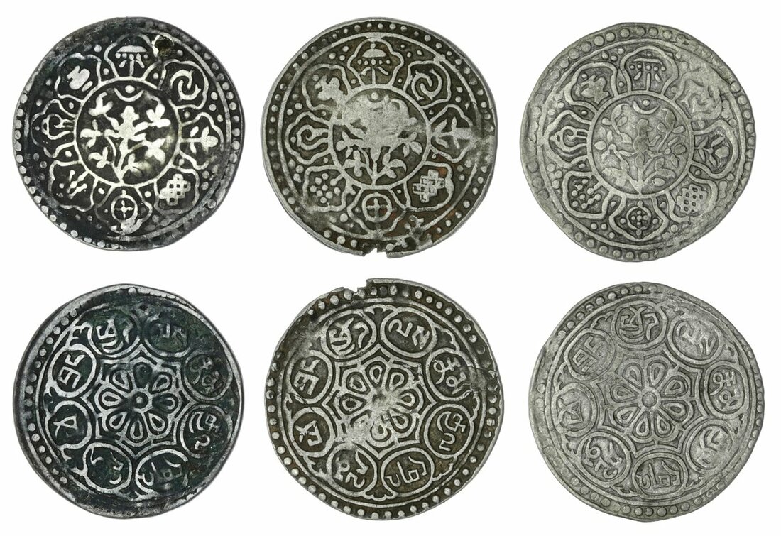 Tibetan Government, Anonymous (c.1840-50), Gaden Tangkas, group A (3), Dod-pal mint, undated, lotus with single stalk, die variants, all with fishes in north-east symbol swimming clockwise, rev. hollow buds (Rhodes Aii; KM. A 13.2), fine to good fine (3)
