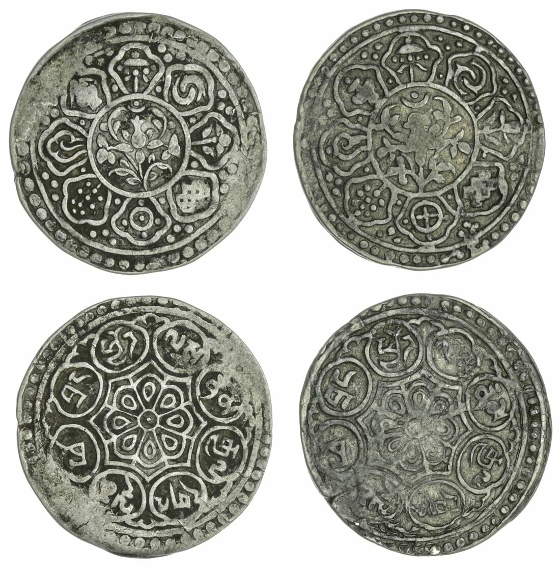 Tibetan Government, Anonymous (c.1840-50), Gaden Tangkas, group A (2), Dod-pal mint, undated, lotus with single stalk, the first coin with this bent right, north-east symbol with fishes swimming clockwise and anti-clockwise, rev. hollow buds (Rhodes Aii; KM. A 13.2), the second possibly ex mount, generally fine (2)