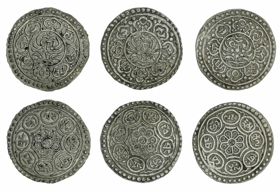 Tibetan Government, Anonymous (c. 1880-94), Gaden Tangkas, group B (3), Dod-pal mint, undated, lotus with double wavy line beneath, bead by conch in western postion, the third with fishes swimming clockwise in north-east position (Rhodes Biii; KM. B 13.3), very fine or better (3)