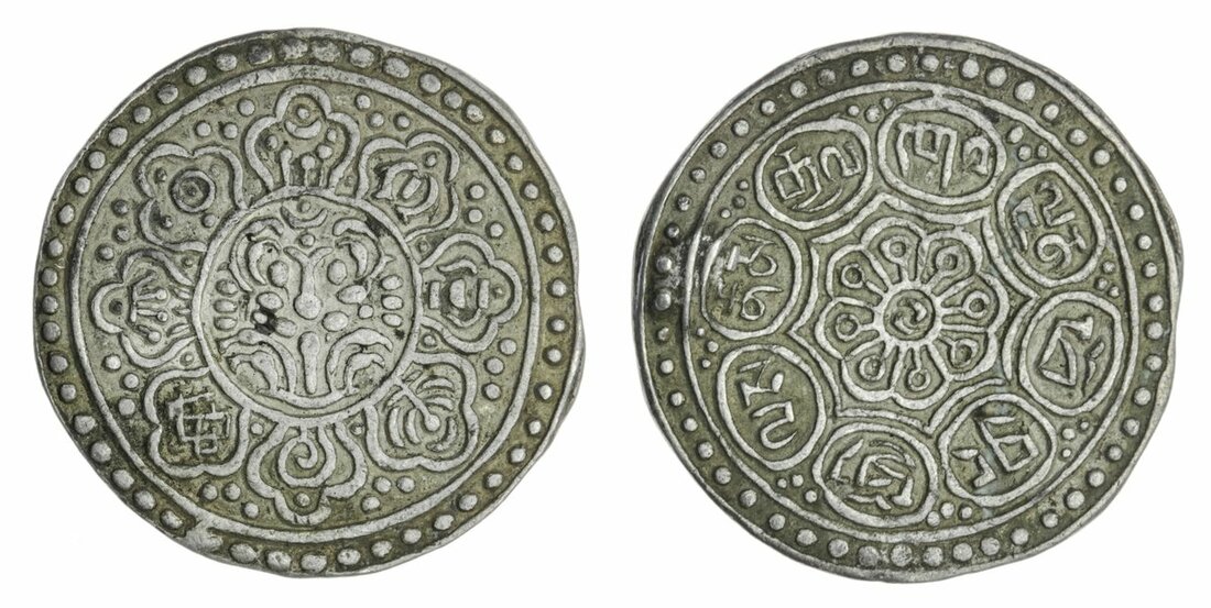 Tibetan Government, Anonymous (c. 1896-99), Gaden Tangka, type D, undated, three beads in margins both sides, lump in flan in west position, with Rhodes ticket noting 'gold lump' (Rhodes Div var; KM. D 13 type), good very fine and rare