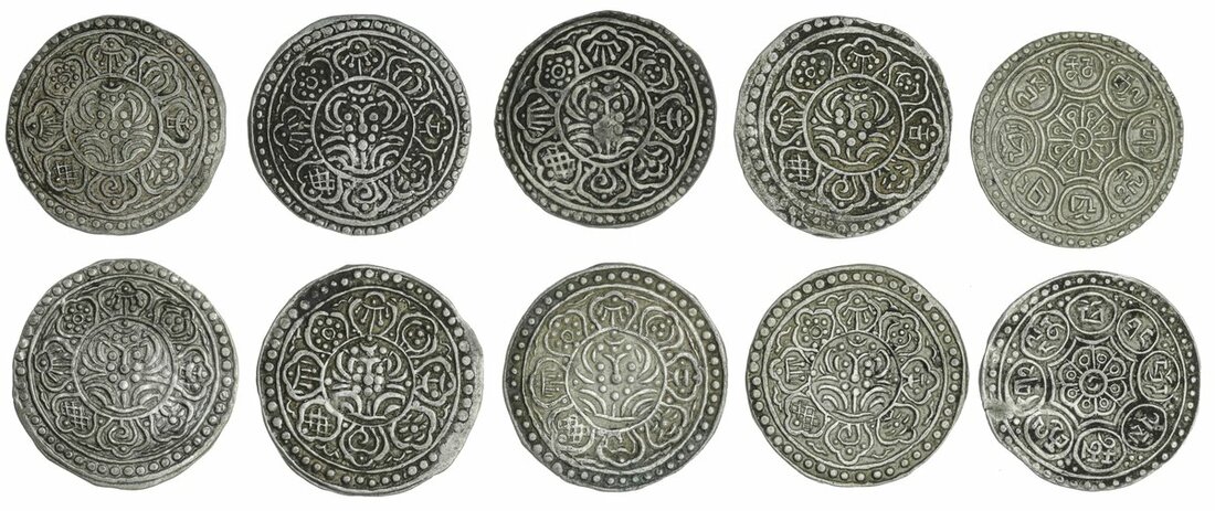 Tibetan Government, Anonymous (c. 1899-1907), Gaden Tangkas, type E (10), Dod-pal mint, undated (Rhodes Ei (2), Eii, Eiii (2), Eiv (2), Evi (2), Evii; KM. E 13 type), generally very fine or a little better, the last a scarce variant (10)