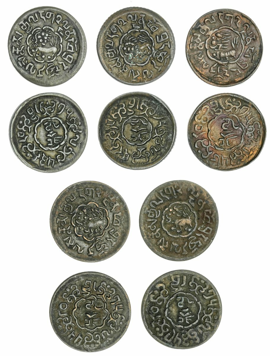 Tibetan Government, Anonymous, AE 5-Skar (5), Dode mint, T.E.15-52 to 15-56 (1918 - 1922), a complete date set of the 5-Skar coins of type Y # 19 (21mm), including scarce date 15-55 (KM. Y#19), generally very fine or better, selected for quality (5)