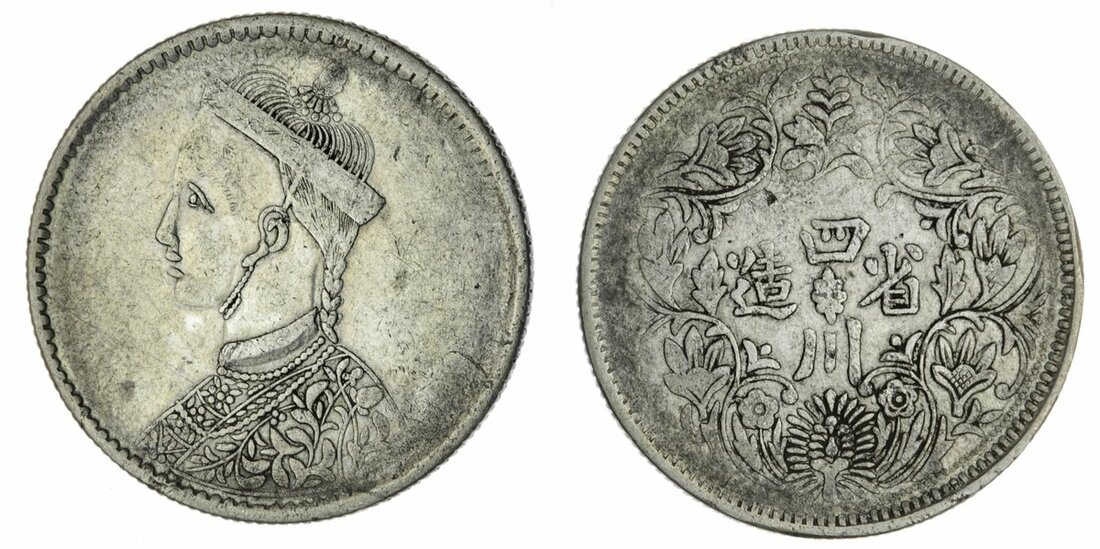 China, issued for Tibet, Sichuan Rupee, 10.94g, undated, small head with collar, large eye, rev. vertical rosette, with leaf in north-east position (YZM 451-472; KM 3.2), about very fine