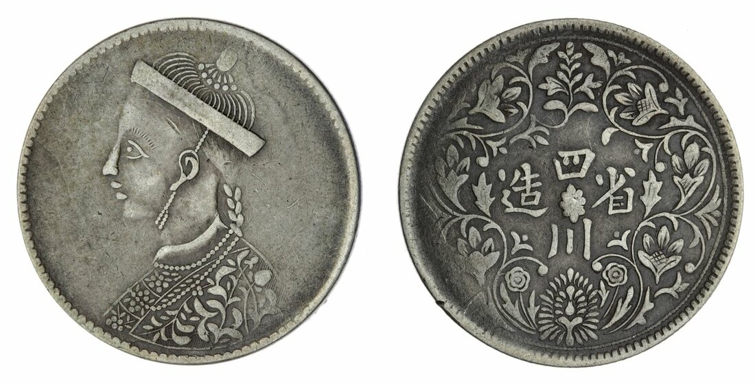 China, issued for Tibet, Sichuan Rupee, 10.94g, undated, small head with collar, large eye, rev. vertical rosette, with leaf in north-east position (YZM 451-472; KM 3.2), toned, about very fine