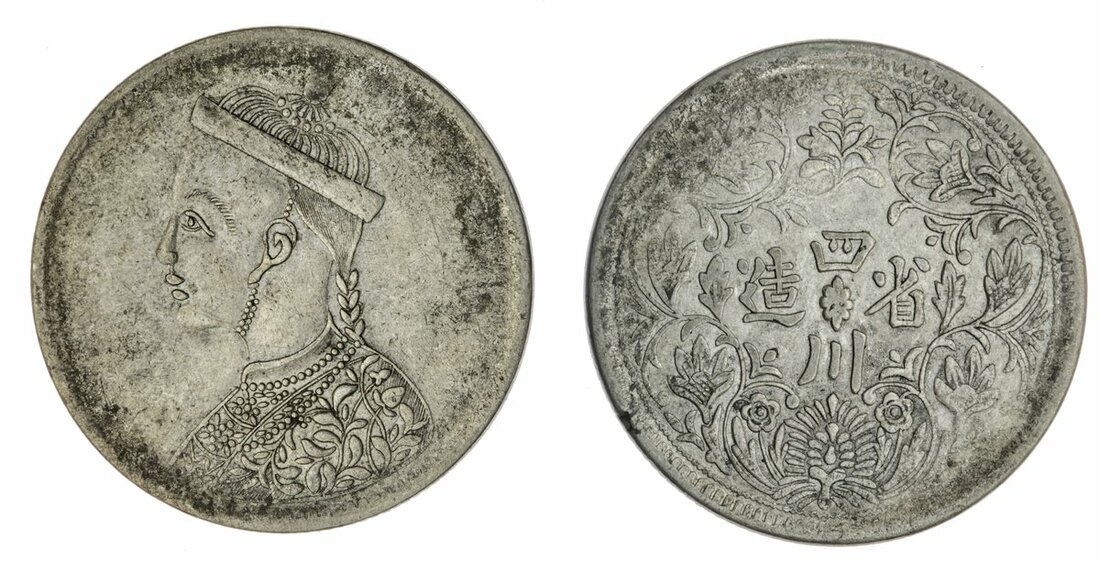 China, issued for Tibet, Sichuan Rupee, 10.80g, undated, small head with collar, string of pearls below the collar is composed of 15 pearls, instead of the usual 14, rev. vertical rosette, with leaf in northeast position (YZM 451-472; KM 3.2), weakly struck, about very fine