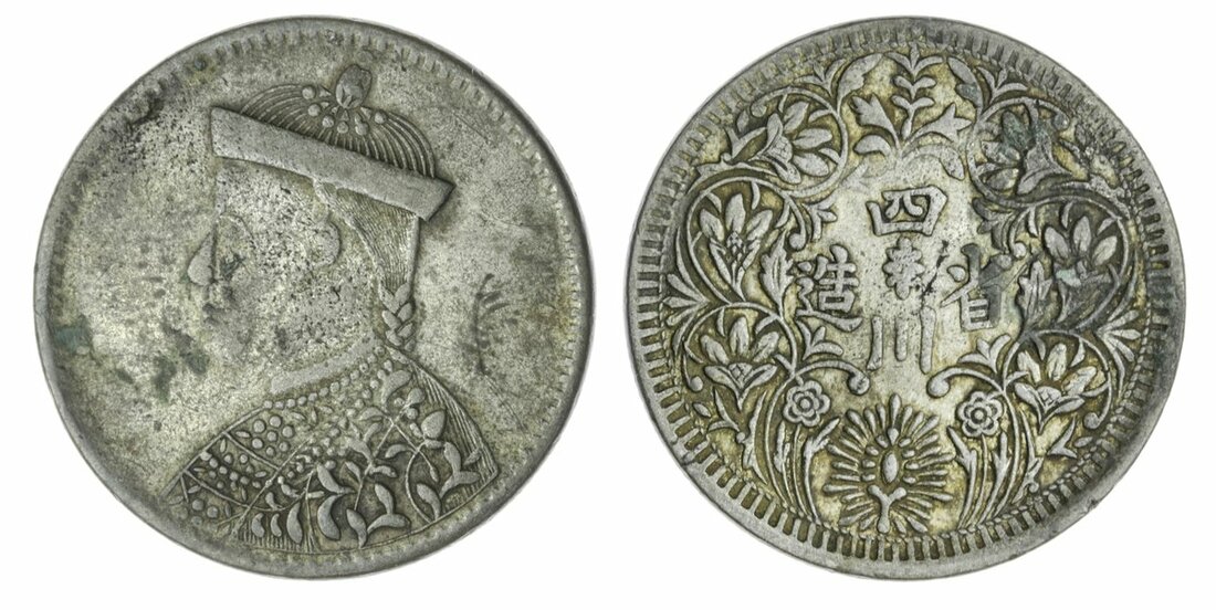 China, issued for Tibet, Sichuan Rupee, 10.47g, undated, large head with collar, string of pearls below the collar is composed of 12 pearls, rev. vertical rosette, without leaf in northeast position (YZM 480-484; KM. Y #3b), rather dirty, fine