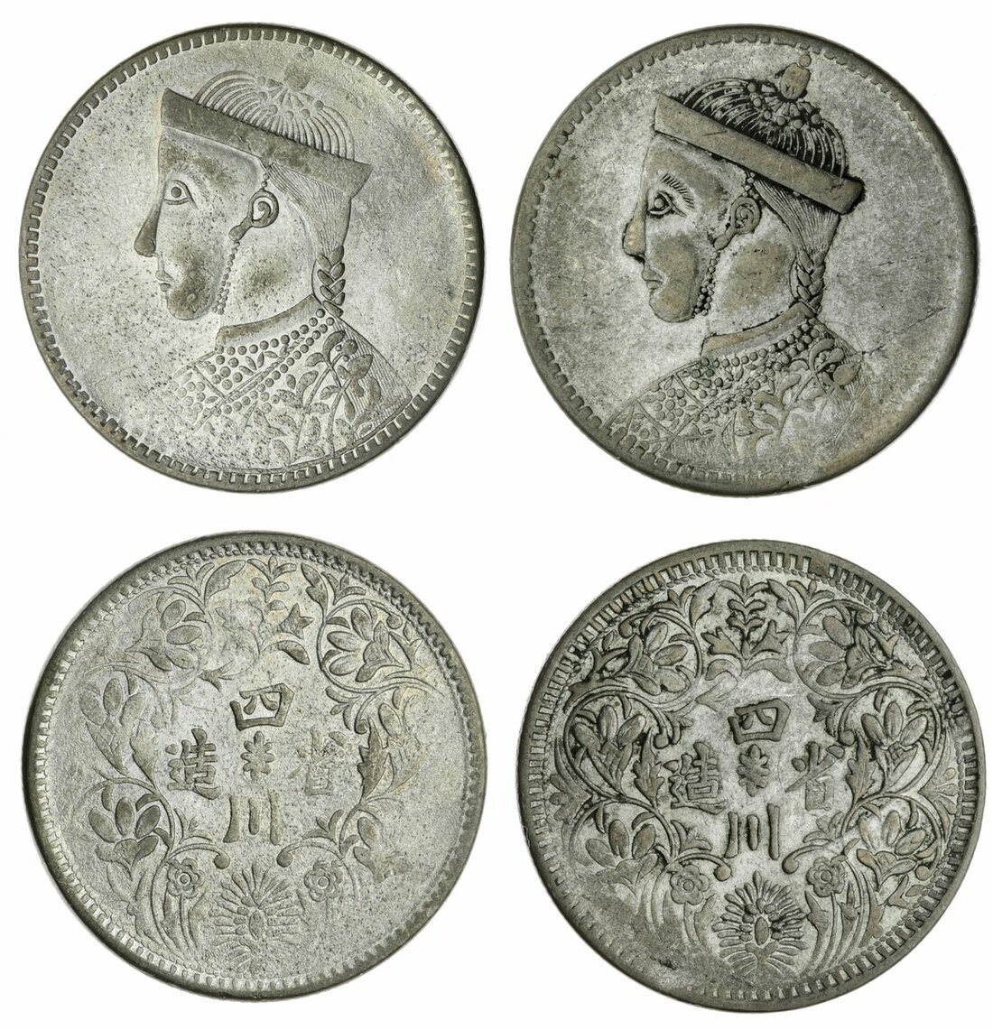 China, issued for Tibet, Sichuan Rupees (2), 11.34g, 11.57g, undated, large head with collar, the string of pearls below the collar is composed of 11 beads in first coin and 13 pearls in other, rev. vertical rosette, without leaf in northeast position (YZM 480-484; KM. Y #3b), very fine and fine (2)