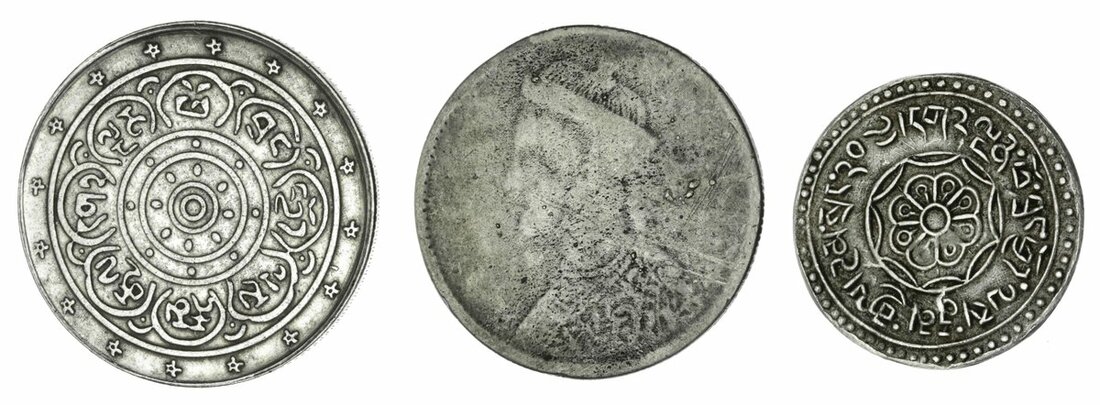 Tibet, Fantasy issues, forgery of a 5-Sho, 9.87g, first year (1909), Anonymous, forgery of a 20-Tam Srang, struck in silver, 3.20g, 15-53, good very fine;Anonymous, forgery of a Sichuan Rupee, 9.66g, undated, small head with collar, string of pearls containing only 13 pearls, rev. vertical rosette (YZM - ; KM 3.2 for type), very good / fine (3)