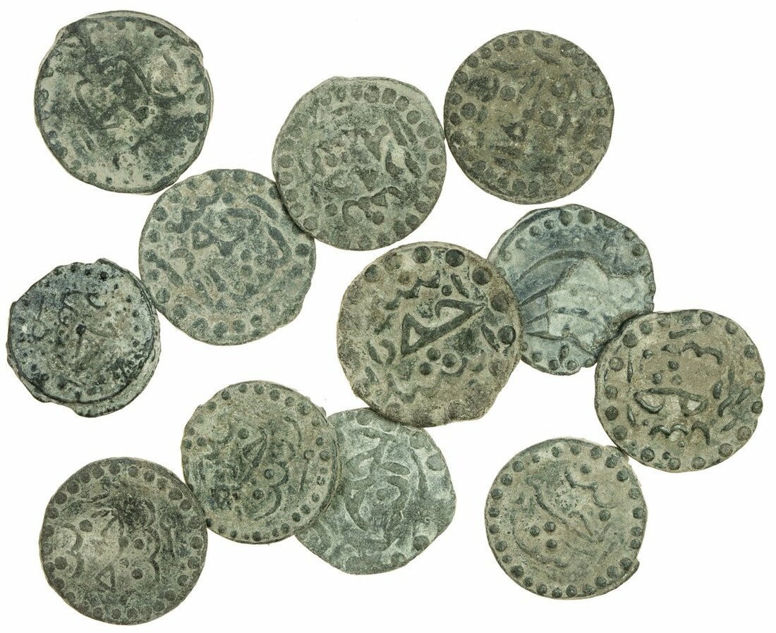 Recently many coins with variations on the same legends and partial dates have been found. The variety of coins found in this and the next lot suggests that they were cast over a longer period than first thought.