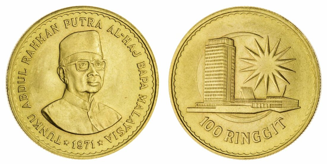 (x) Malaysia, Abdul Rahman Putra al-Haj, gold 100-Ringgit, 1971, head of Prime Minister facing, rev. skyscraper and rising sun on crescent, .916 Fine, 18.67g, 12h, edge milled (Schön 56; KM 11; Fb. 1), choice uncirculated