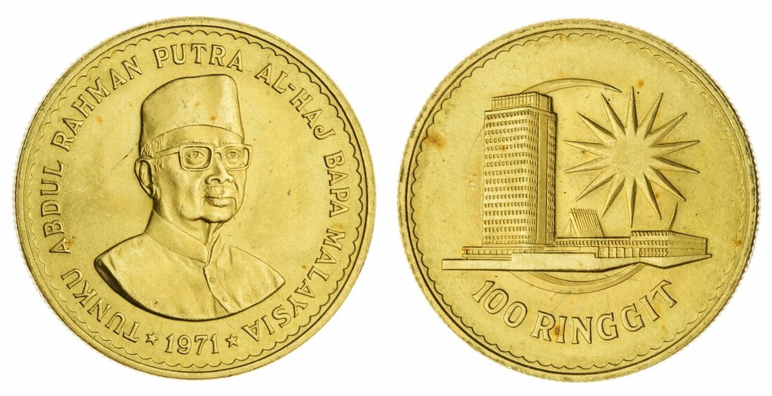 (x) Malaysia, Abdul Rahman Putra al-Haj, gold 100-Ringgit, 1971, head of Prime Minister facing, rev. skyscraper and rising sun on crescent, .916 Fine, 18.67g, 12h, edge milled (Schön 56; KM 11; Fb. 1), toning spots, otherwise choice uncirculated