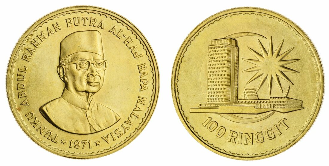 (x) Malaysia, Abdul Rahman Putra al-Haj, gold 100-Ringgit, 1971, head of Prime Minister facing, rev. skyscraper and rising sun on crescent, .916 Fine, 18.64g, 12h, edge milled (Schön 56; KM 11; Fb. 1), toning spots, otherwise choice uncirculated