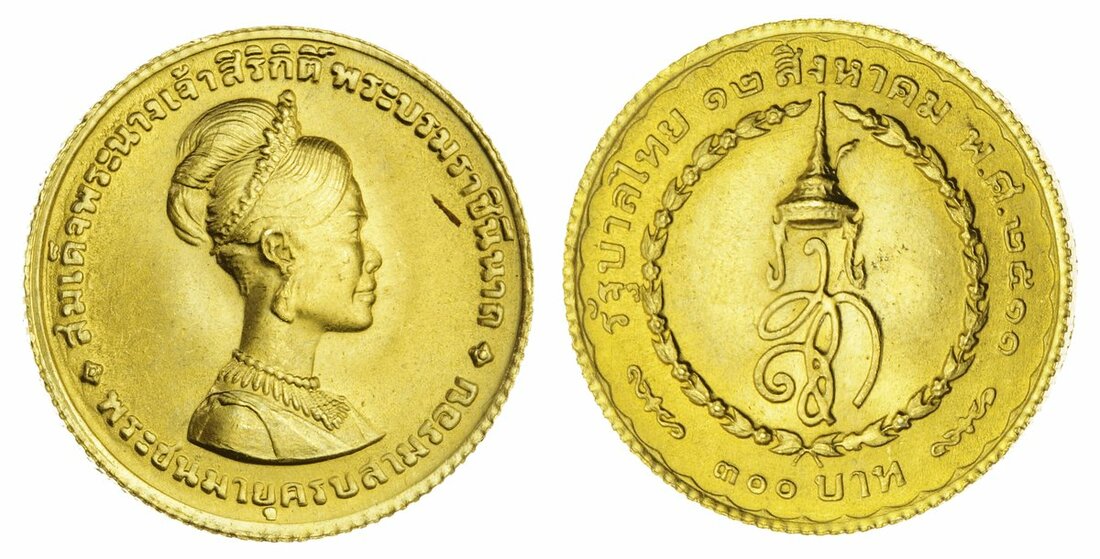 (x) Thailand (Siam), Rattanakosin, Rama IX {Phra Maha Bhumifhol Adulyadei} (1946-2016), gold 300-Baht, BE 2511 [1968], head of Queen Sirikit Kitiyakara, Commemorating her 36th Birthday, 7.37g, 12h, edge milled (KM Y.89; Fb. 28), choice uncirculated