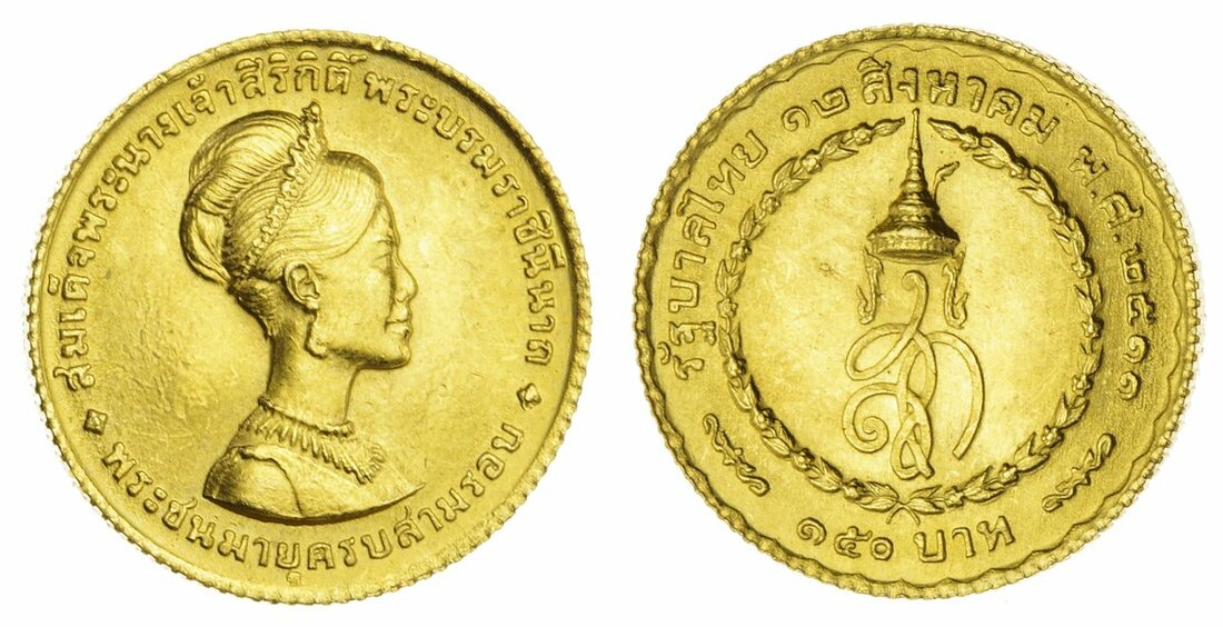 (x) Thailand (Siam), Rattanakosin, Rama IX {Phra Maha Bhumifhol Adulyadei} (1946-2016), gold 150-Baht, BE 2511 [1968], head of Queen Sirikit Kitiyakara, Commemorating her 36th Birthday, 3.69g, 12h, edge milled (KM Y.88; Fb. 29), lustrous, good extremely fine