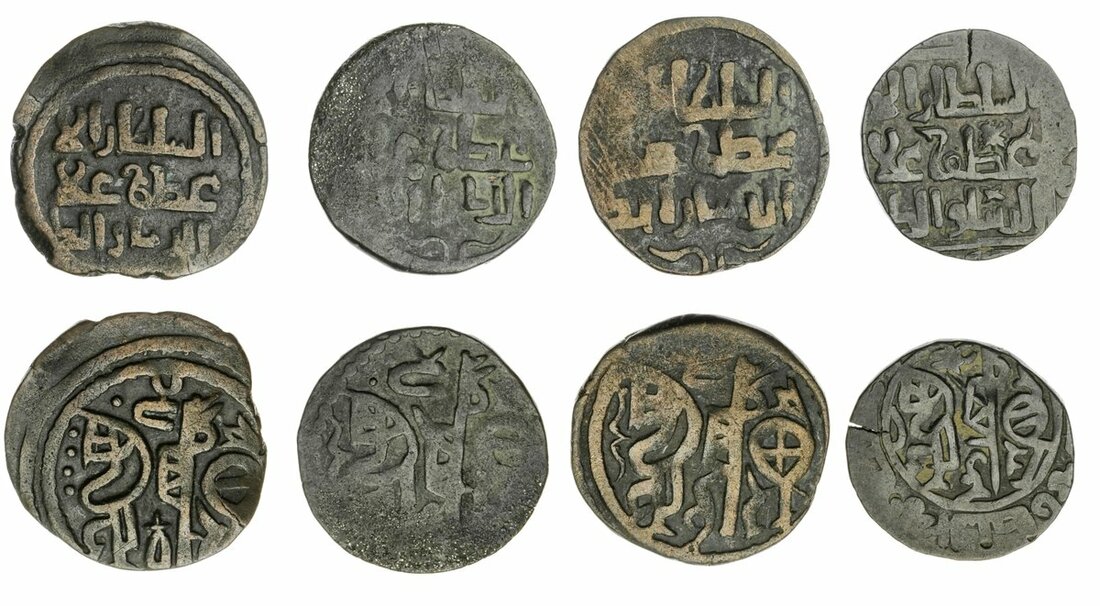Khwarezm Shah, 'Ala ud-din Muhammad (1200-20), large AE Jitals (4), Rajput style, Qunduz, Arabic legend, rev. horseman left with either three beads or bow before, different symbols on rump, one with legend in margins (A. 1739.3, 1739.4; MWI 914; Tye 238, 240 var, 240.1, 240.3), four different varieties of this scarce series, fine to very fine (4)