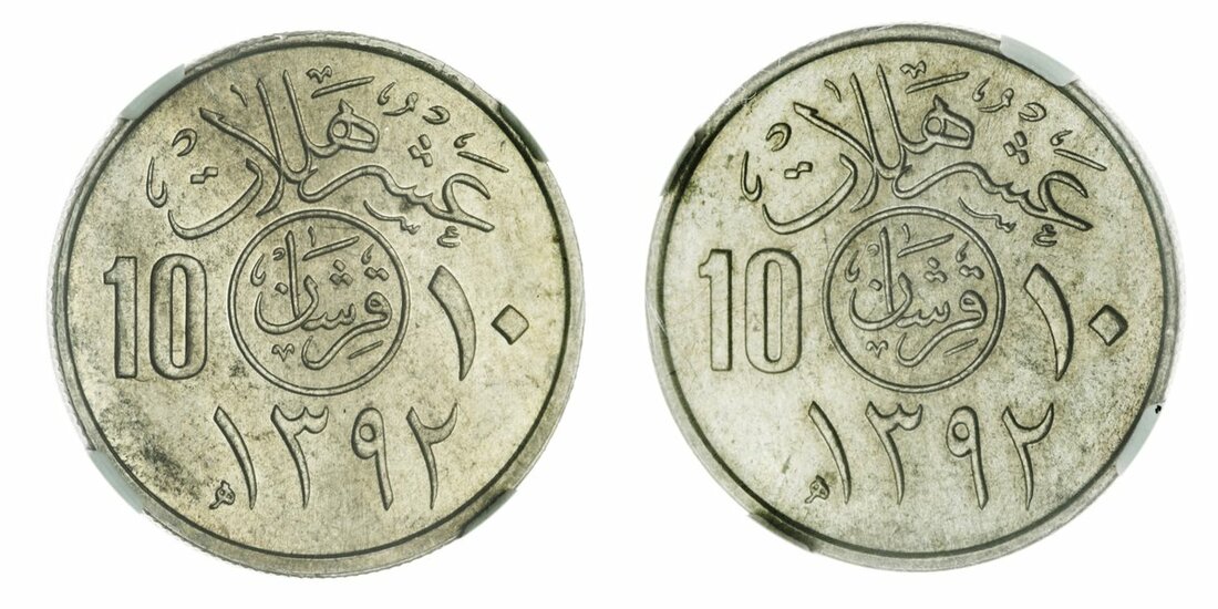 (x) Saudi Arabia, Reform Coinage,10-Halala, reverse brockage, AH1392 (1972) (KM 46), graded by NGC MS 65, rare mint error