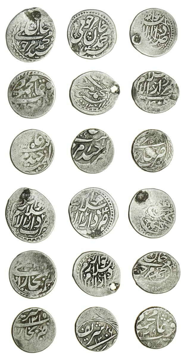 Uzbekistan, Bukhara, Abd Al-Ahad, (1886-1910), Tengas (4), AH1306, 1308, 1315, 1319 (KM 75); Khiva, Sayyid Muhammad Rahim (1865-1910), Tengas (5), Khwarezm, AH1294, 1311, others with unclear dates (KM Y#6), the coins of Khiva pierced and reparied, about fine to good fine (9)