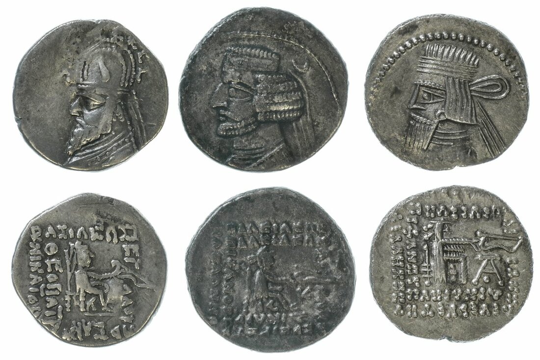 Parthian Empire, Drachms (3), Sinatruces / Phraates III (c.70-57 BC), crowned bust left, rev.archer seated on throne right, Orodes II (c.57-38 BC), diademed bust left, rev. archer seated on throne right, Artabanus II / IV (c.10-38 AD), similar to previous, but ornamental loop ties diadem (Sell. 39, 47, 63; Sunrise 340, 371, 410), about very fine to good very fine (3)