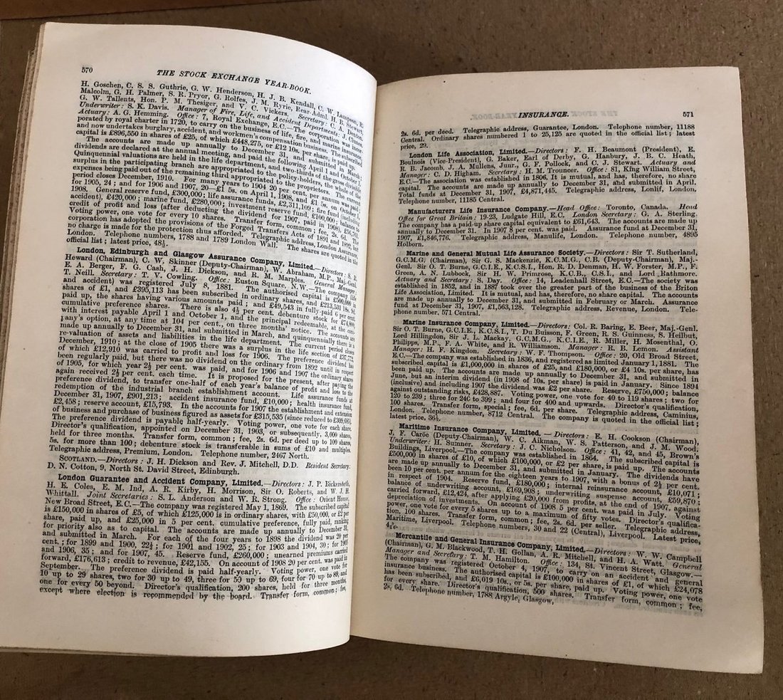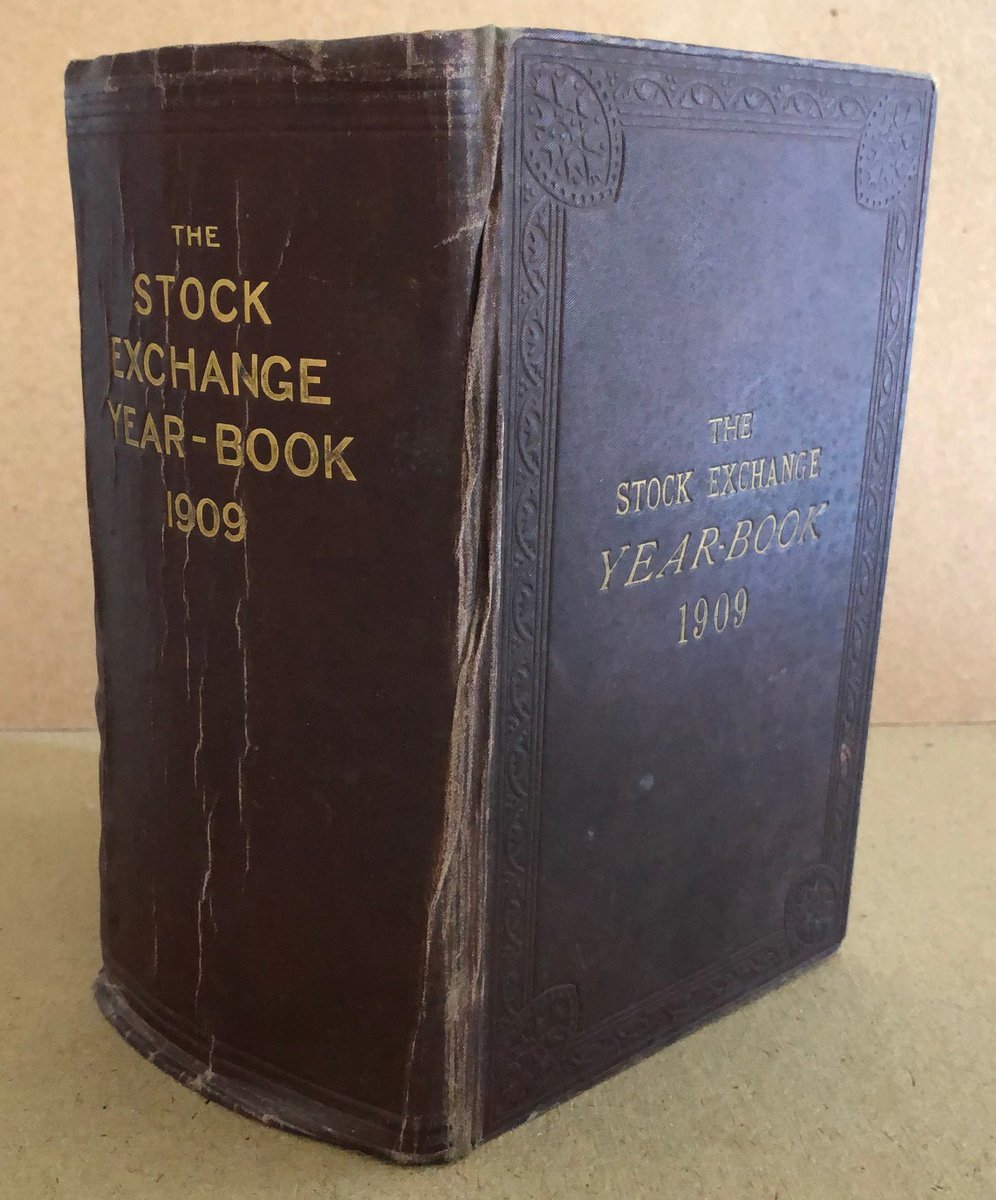 Book: The Stock Exchange Year-Book, 1909, lxviii + advertisements + 2296pp + xlviii advertisements, essential reference for all companies, British and Foreign, quoted on the London Stock Exchange, cloth, Some wear to binding and a bit loose but contents in good condition.