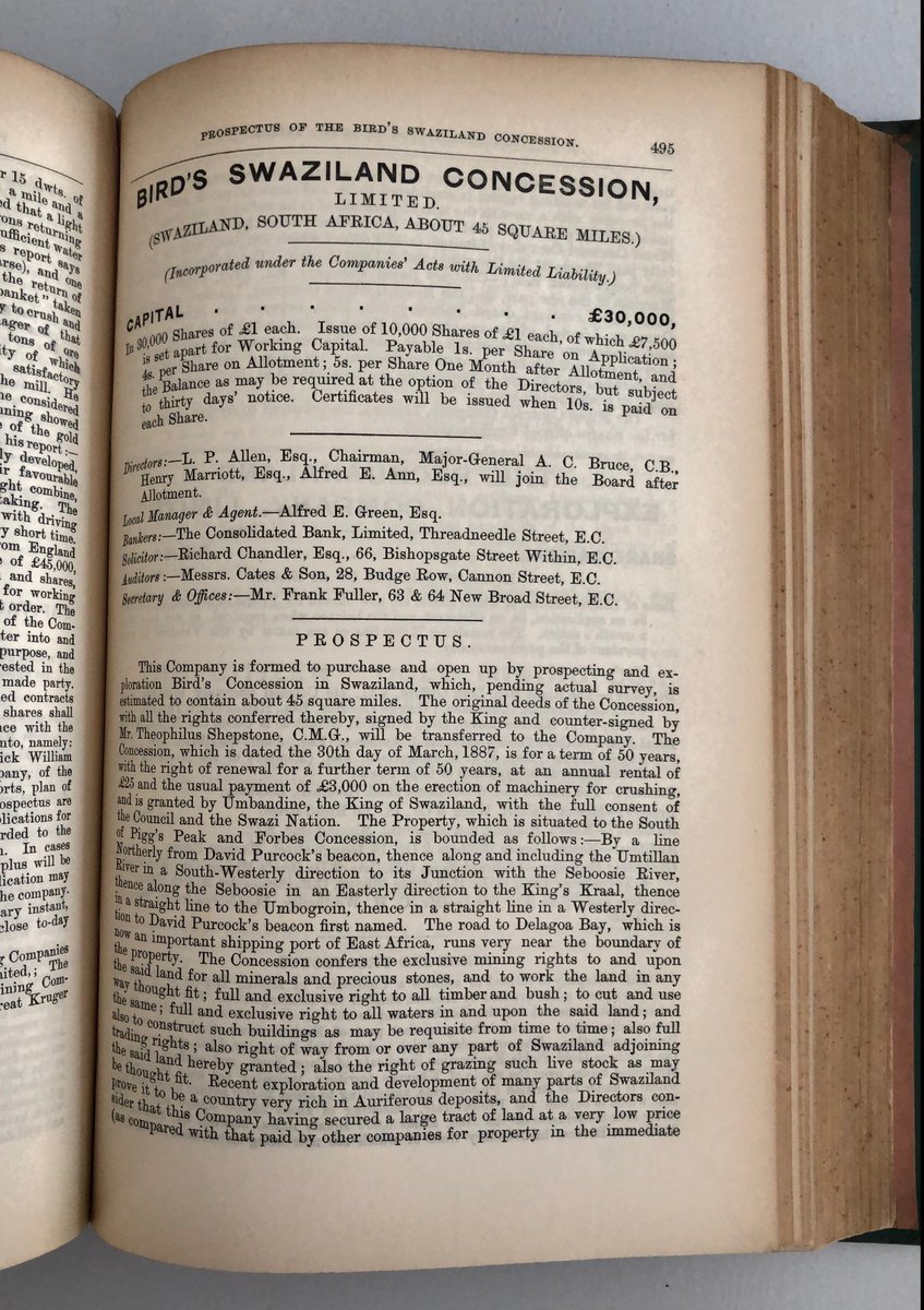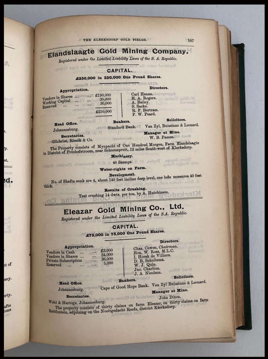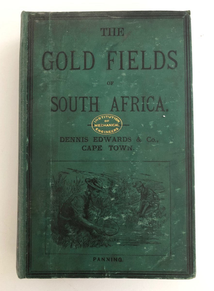 Book: The Gold Fields of South Africa ..... containing full particulars relating to Gold Mining companies, capital, claims....... and copies of the original prospectuses, Cape Town, 1890, 8vo, xxxviii + 915 pp, rebound some time ago in similar green cloth. Invaluable reference for the 1880's gold boom in the Transvaal. A rare book, ex Veissid auction October 2001. A few pages brittle but generally good condition.