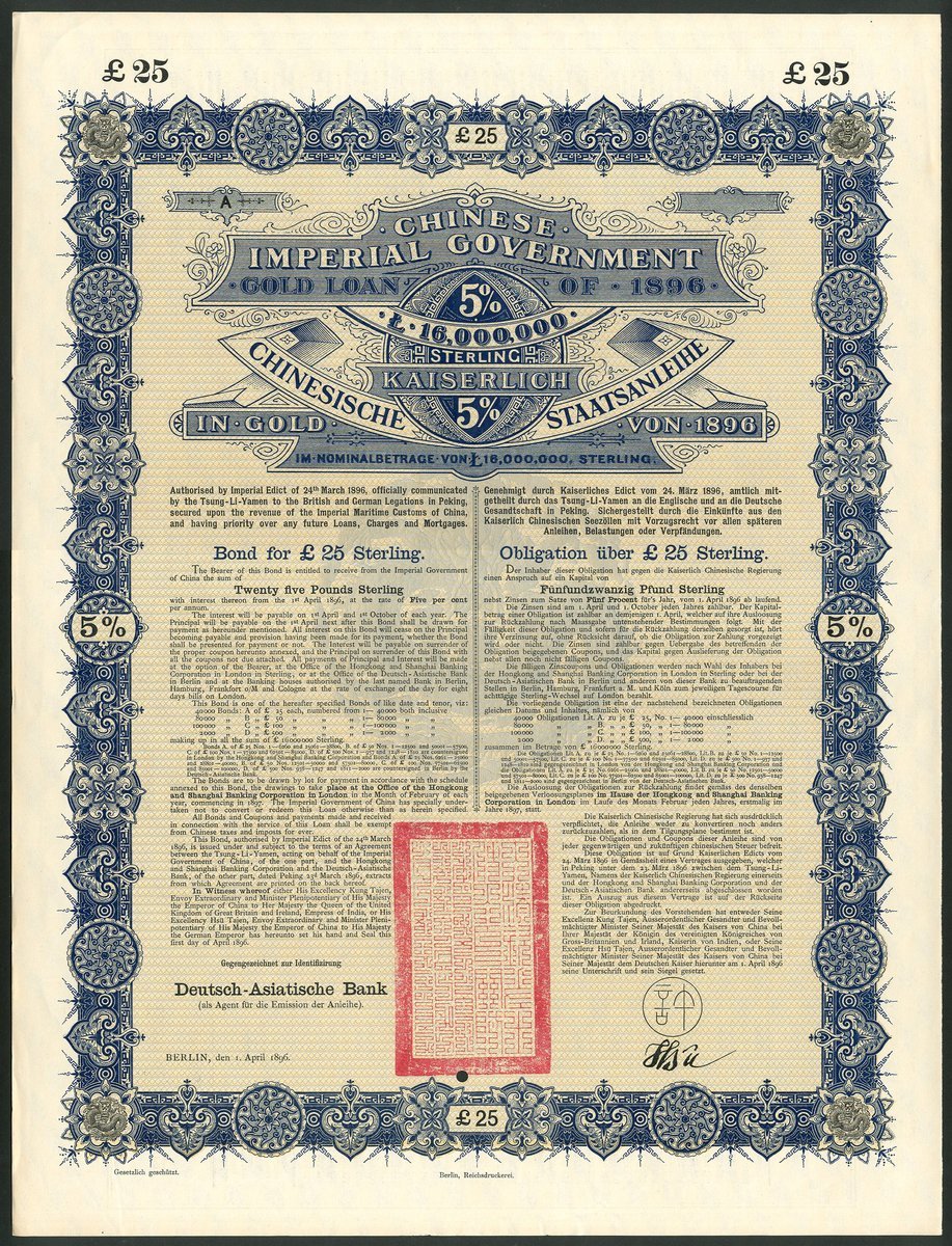 (x) China: 1896 5% Gold Loan, an unissued reserve stock bond for £25, issued by the Deutsch-Asiatische Bank, large format piece, blue and black, no coupons, small hole cancel. Almost UNC.