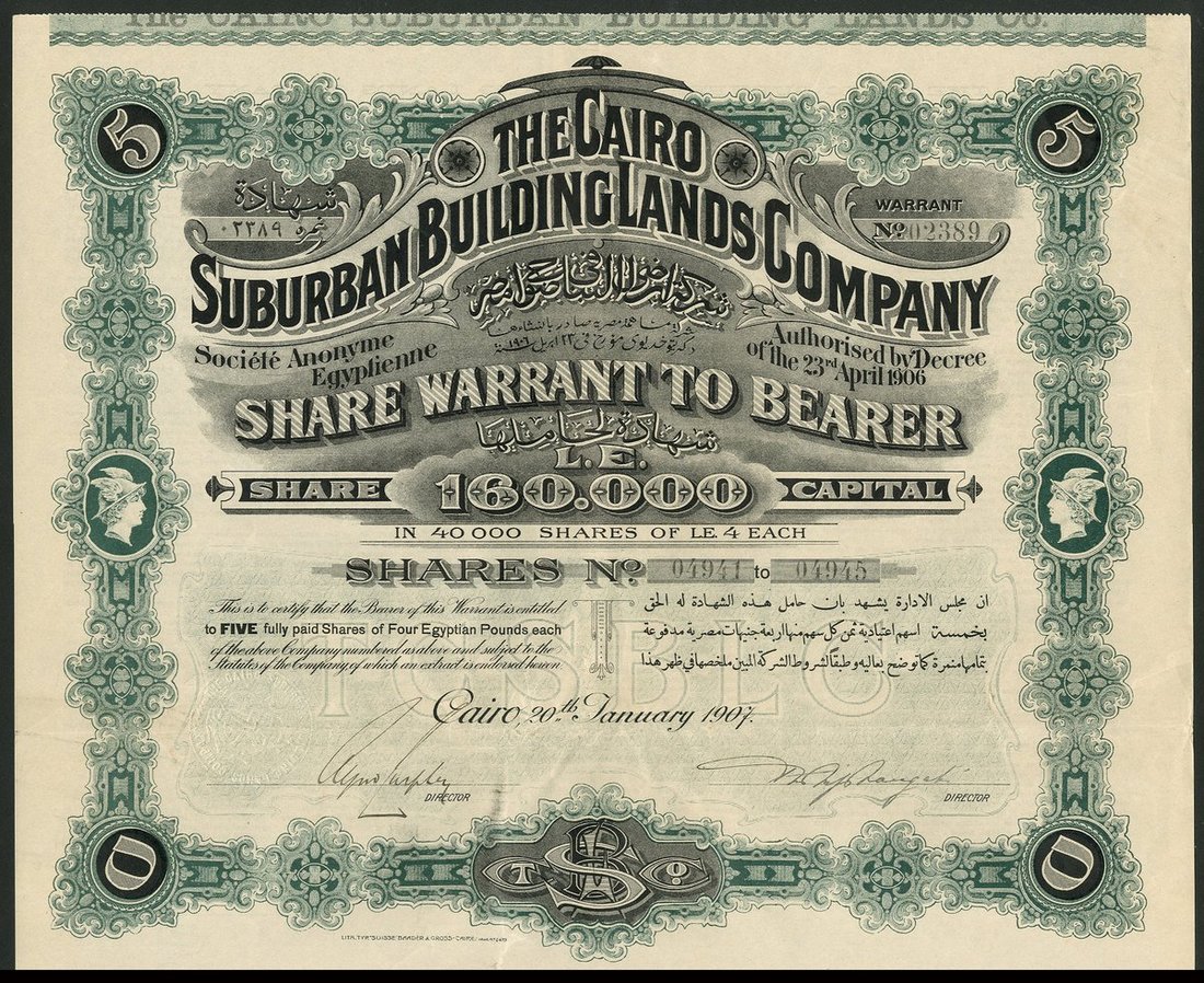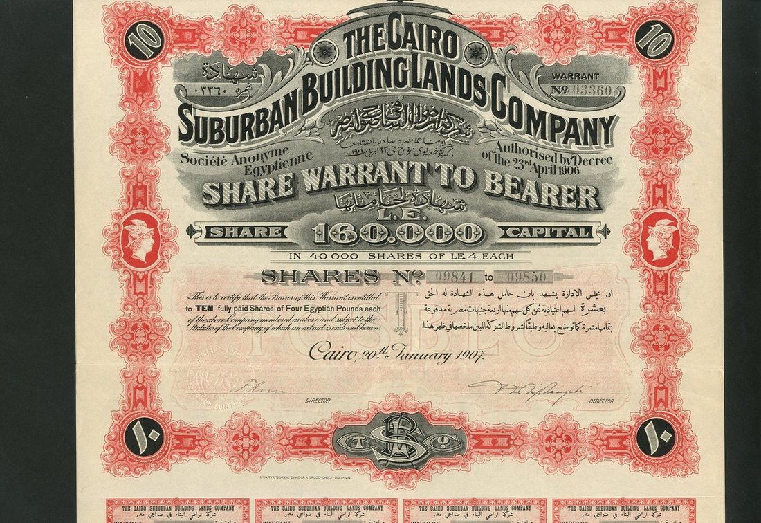 Egypt: Cairo Suburban Building Lands Company, a pir of certificates for 5 shares and 10 shares of LE.4, both Cairo 1907, ornate borders, text in English and Arabic, green and red respectively, with coupons. GVF+ (2).