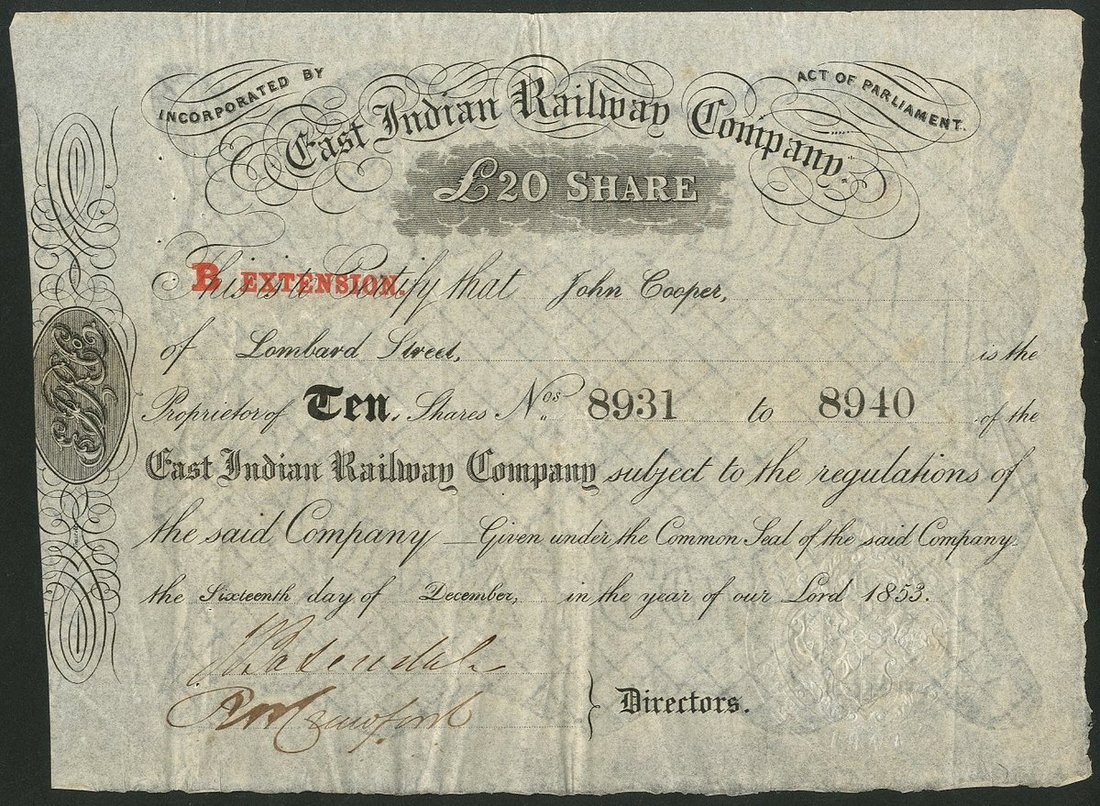 India: East Indian Railway Company, certificate for 10 shares of £20, 'B' Extension, 1853, #8931-8940, black and red, embossed seal. VF.