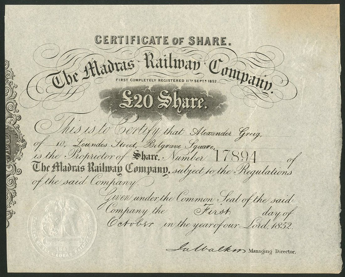 India: Madras Railway Company, £20 share, 1852, #17894, black, attractive embossed seal. Near EF.