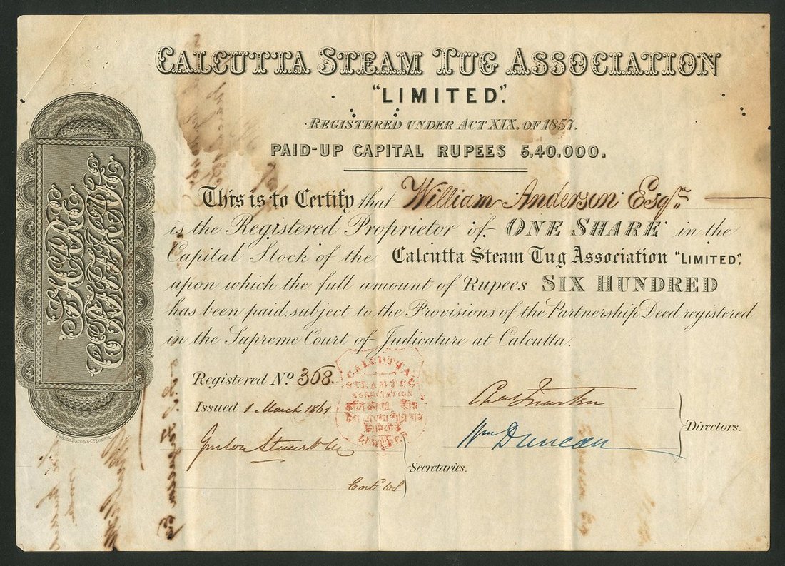 India: Calcutta Steam Tug Association Ltd., 600 rupee share, [1861], #368, scrollwork at left, black, printed by Perkins, Bacon & Co. Some light waterstaining but VF and a scarce early piece.
