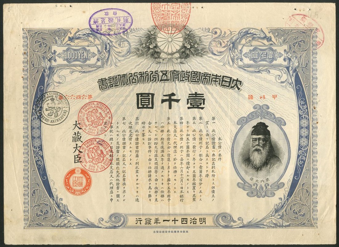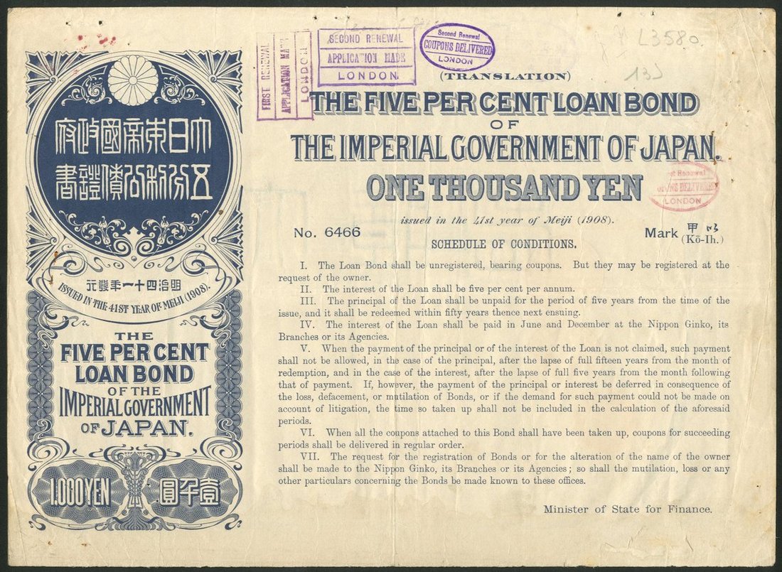 Japan: Imperial Japanese Government, 5% Loan, 1908, bond for 1000 yen, Mark 'Ko-Ih', #6466, vignette of Takeuchi Sukune at right, very ornate border, text in Japanese on front with English translation on reverse, blue, black and yellow, with coupons. F-VF and scarce.