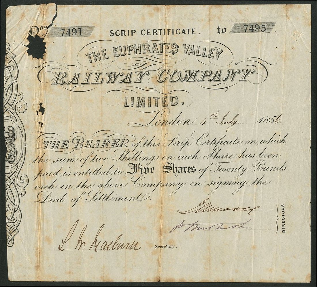 Ottoman Empire/Iraq: Euphrates Valley Railway Co. Ltd., scrip certificate for five shares of £20 each, 185[6], #7491-7495, scrollwork at left, black. Formed to build a Railway from Anah along the Euphrates Valley to the Persian Gulf, providing an overland route to India. The scheme was well supported by Parliament, but the line never came to fruition. Spinke hole and damage to top left corner, heavy folds but AF and rare.