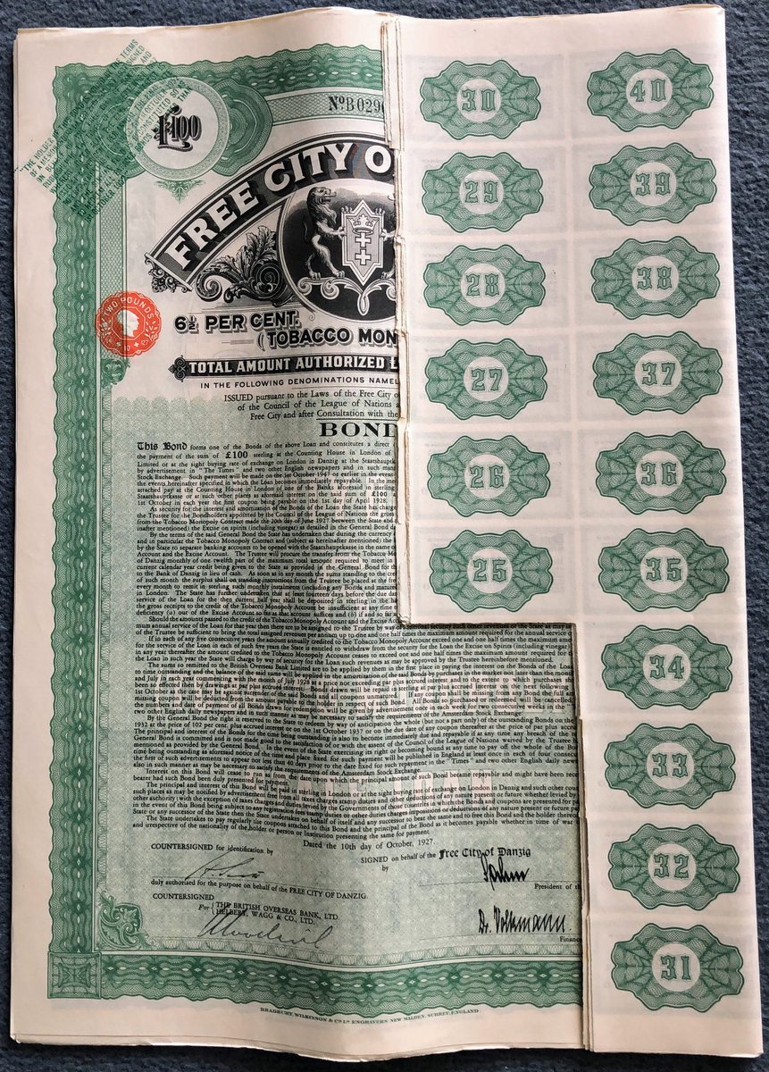 Danzig: Free City of Danzig, 1927, 6½% State Loan (Tobacco Monopoly), a group of 10 bonds for £100, consecutively numbered B2980-B2989, arms at top, ornate border, green and black, printed by Bradbury, Wilkinson, with coupons. Virtually uncirculated (10).