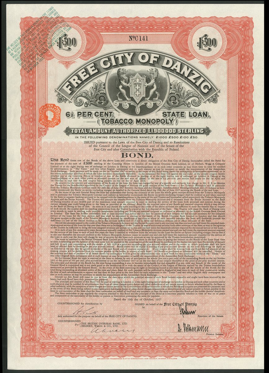 Danzig: Free City of Danzig, 6½% State Loan (Tobacco Monopoly), a rare bond for £500, #C141, large format, city arms at top, red, printed by Bradbury, Wilkinson & Co., with coupons from 1940. EF and rare.