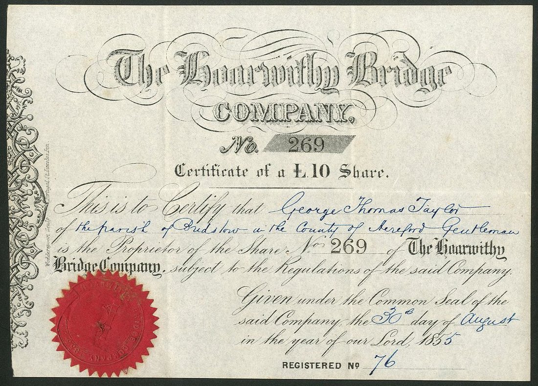 Great Britain: Hoarwithy Bridge Company, £10 share, 185[5], #269, black, red paper seal depicting bridge. A toll bridge crossing the river Wye on the road between Ross and Hereford. Originally built of timber it was replaced in the 1870's by a 300 foot iron structure. VF and rare [R10].