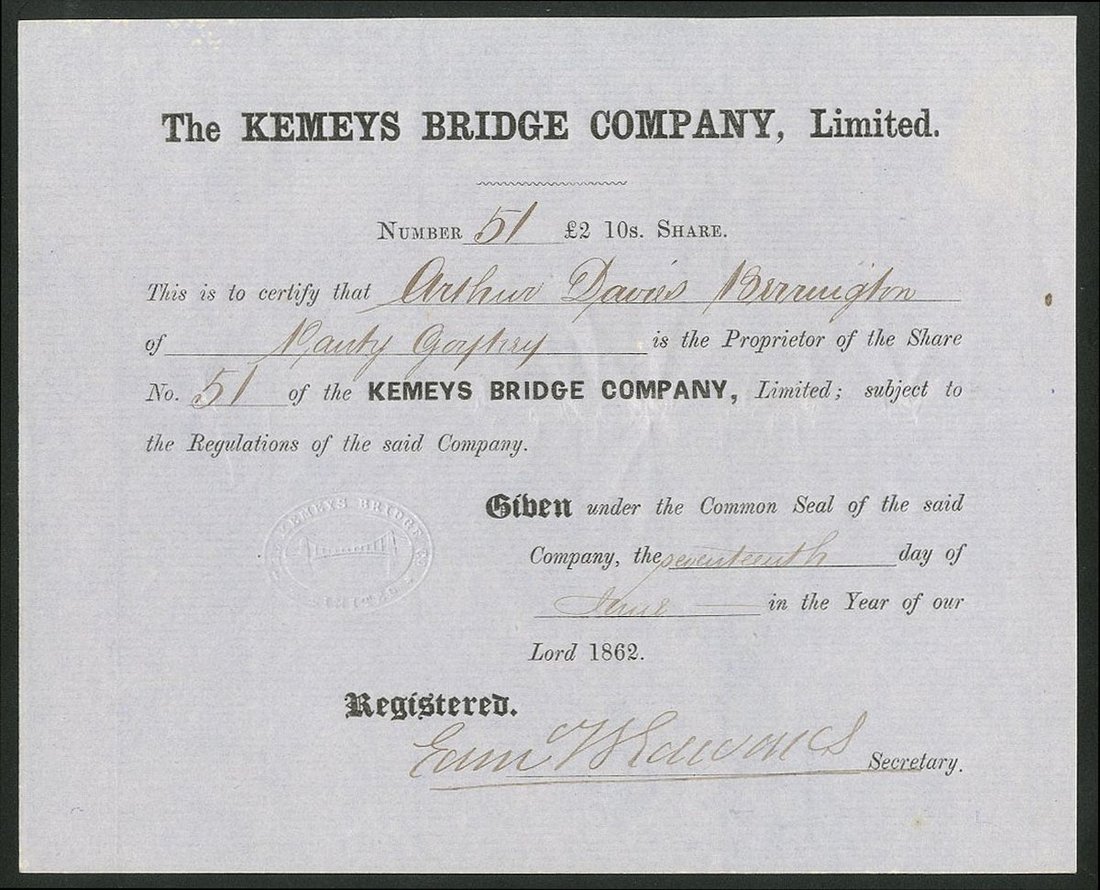 Great Britain: Kemeys Bridge Co. Ltd., £2 10s share, 1862, #51, small format piece printed in black on grey paper. Originally incorporated in 1829 to erect a bridge across the River Usk in Monmouthshire. The Chain Bridge was built about 1830. Purchased by the Monmouthshire County Council in 1901 and replaced by a new bridge in 1905/06. EF.