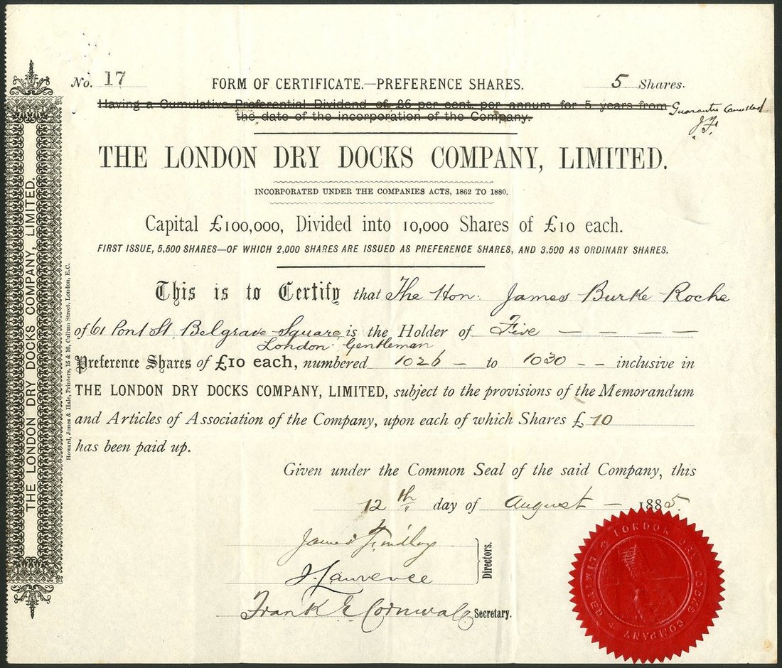 Great Britain: London Dry Docks Company Limited, £10 preference shares, 188[5], #17, scrollwork at left, black, red paper seal. VF and rare.