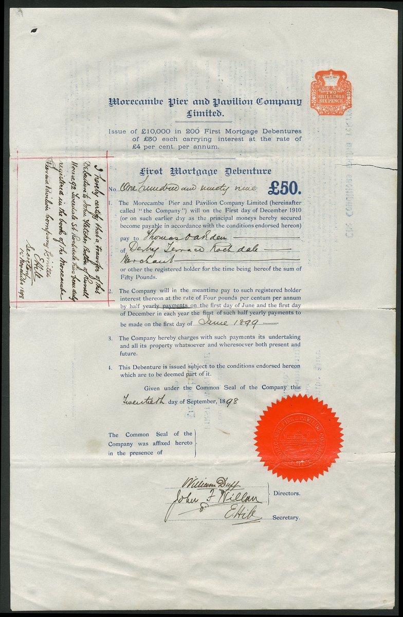Great Britain: Morecambe Pier and Pavillion Co. Ltd., 4% first mortgage debenture for £50, 18[98], #199 of only 200 issued, large format piece, blue printing, large red seal. Construction of the Central Pier began in 1868. This company added the large pavillion which was destroyed by fire in 1933. Small split at fold otherwise VF and rare.