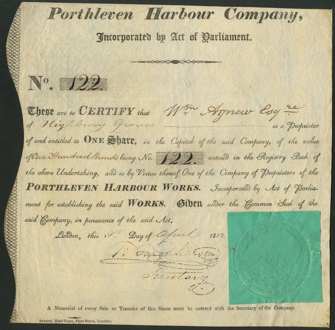 Great Britain: Porthleven Harbour Company, one share, 18[12], #122, attractive early piece printed in black, on vellum, large green paper seal. VF and rare [R10}.